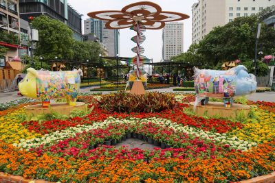 Hãy tản bộ trên đường Nguyễn Huệ ở Thành phố Hồ Chí Minh trong dịp Tết để chiêm ngưỡng lễ hội hoa hàng năm của đường phố. Từ ngày 22 đến ngày 28 tháng 1, đại lộ dành cho người đi bộ này sẽ được biến đổi với màn hình hoa, tác phẩm nghệ thuật và đèn LED công phu. Các tác phẩm sắp đặt theo chủ đề sẽ được thiết lập dọc theo đoạn đường dài 720 mét và du khách có thể thoải mái chụp ảnh với các tác phẩm cắm hoa — một phần yêu thích trong các lễ hội Tết của thành phố.